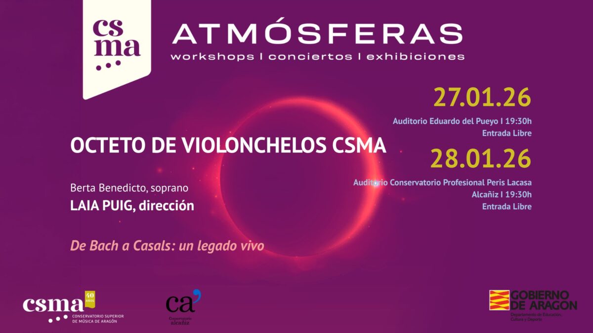 CONCIERTO DEL OCTETO DE VIOLONCHELOS CSMA EN CICLO ATMÓSFERAS CSMA Y EN CONSERVATORIO PROFESIONAL DE MÚSICA DE ALCAÑIZ